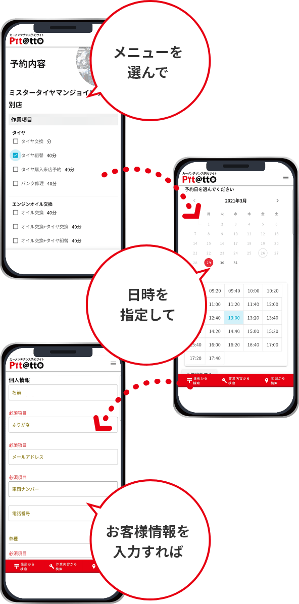 利用したいメニュー、日時を指定し、お客様情報を入力して予約します。