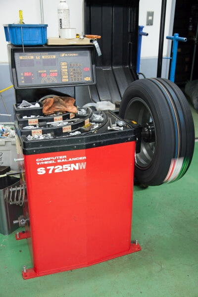 ホイールバランサーという機械で、ホイールの歪みを診断し、その歪みをウェイトと呼ばれる重りを付けて調整します。