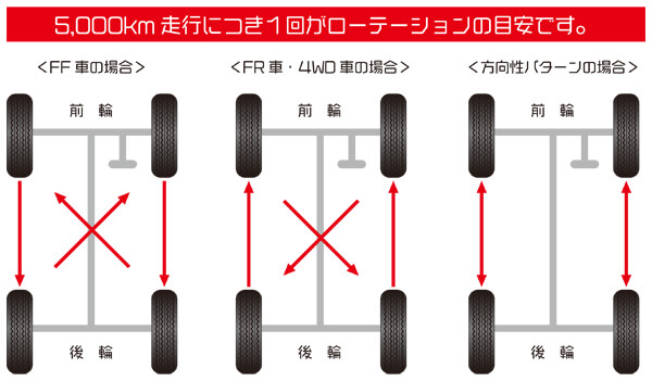 タイヤの取り付け位置を入れ換えることでタイヤの摩耗を均一化させ、トータルでタイヤを長持ちさせることができます。